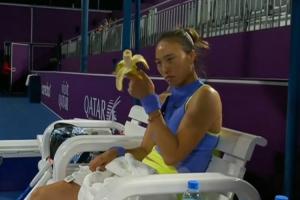 比赛期间,郑钦文在场边补给时,发现香蕉上有蚂蚁,她弹掉蚂蚁后端详再三,接着把香蕉吃了。