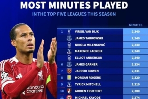 1-范戴克(利物浦),2340分钟