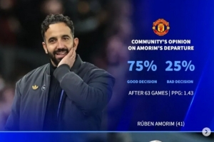 阿莫林(曼联):63场,场均1.43分。75%支持,25%反对。