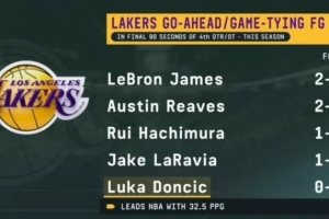 湖人球员本赛季第四节及加时最后90秒出手扳平或反超球情况: