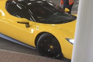 视频显示,这名穿着高亮色夹克的工作人员在停车场倒车,随后他在倒车时猛地左转,右前轮的轮毂似乎蹭到了路缘。在注意到车轮接触到了路缘后,这名司机停了下来,随后另一名工作人员对其进行了指示。